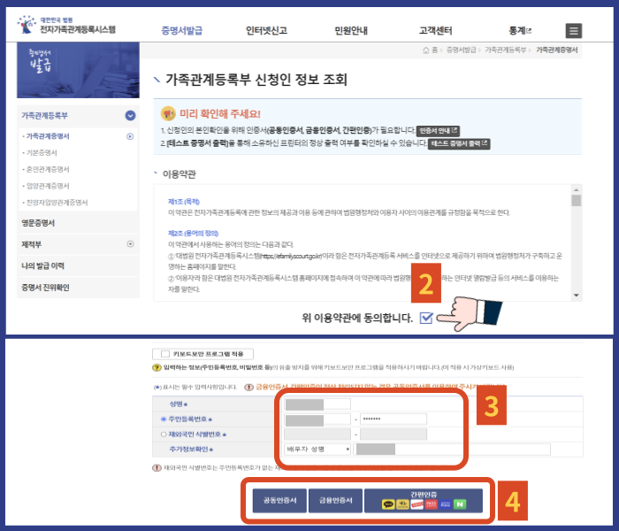 우선 가족관계증명서 인터넷발급 순서를 한 눈에 보고 시작하겠습니다.